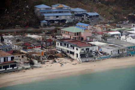 An aerial view of the houses destroyed by Irma during the visit of France’s President Emmanuel Macron to the French Caribbean island of St Martin September 12, 2017. (FILE)