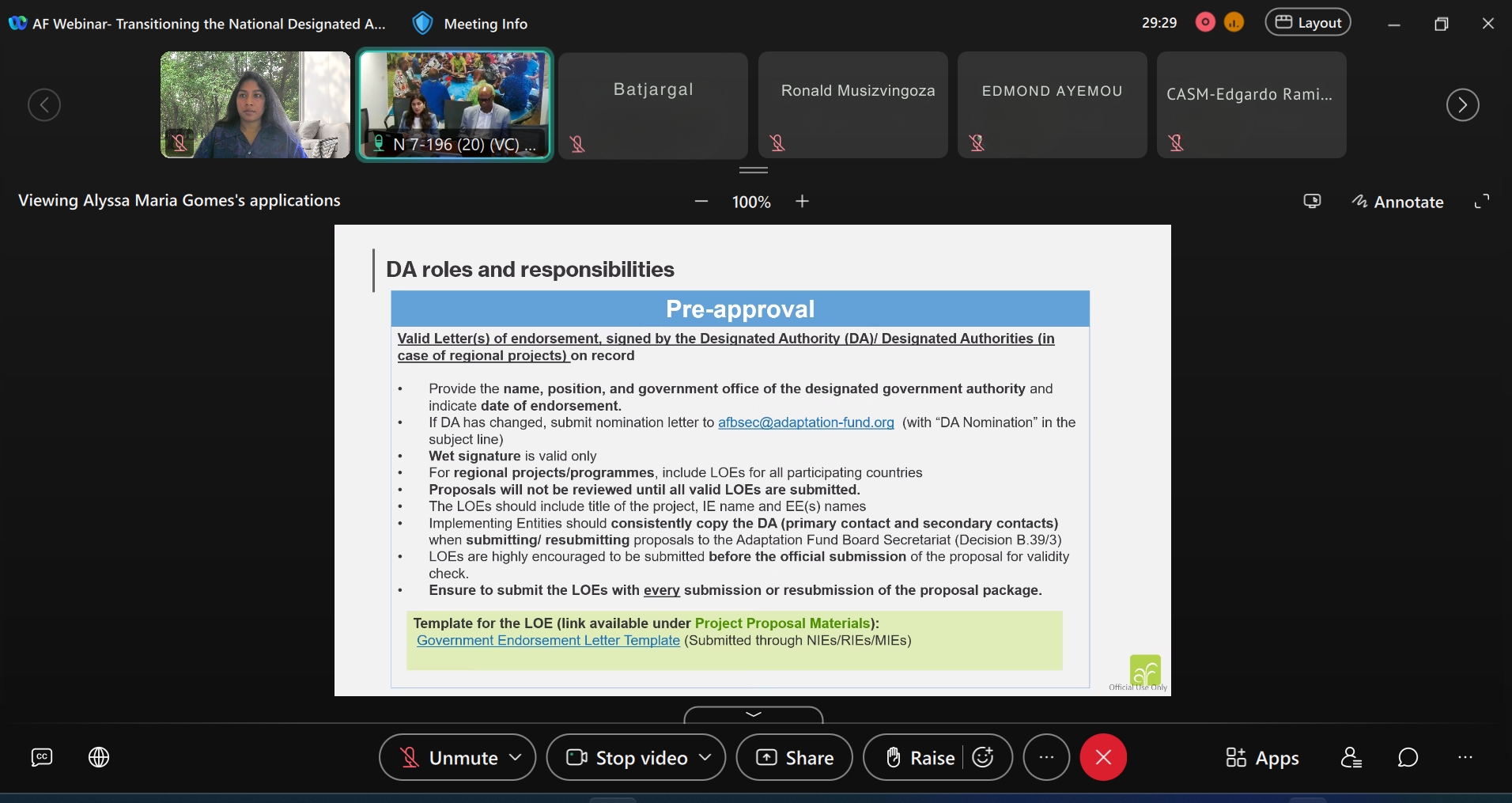 The Adaptation Fund hosted a webinar on “Transitioning the Designated Authority (DA) from Individual to Institutional Leadership”, aimed at supporting national focal points in understanding recent changes to the DA framework and nomination process. This initiative is part of the Fund’s broader strategy to enhance support to developing countries and improve access to adaptation fund resources. During the webinar, participants received detailed guidance on the transition process for the DA from individual to entity, and the crucial role the DA plays during the accreditation of an implementing entity and in the project approval and implementation process.