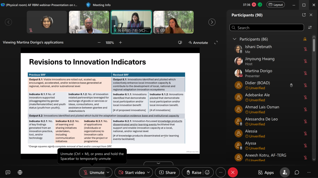 The Adaptation Fund hosted an interactive webinar introducing the latest revisions to the Fund’s Strategic Results Framework (SRF). The session highlighted updates to the core indicators and new indicators focusing on innovation and locally led adaptation (LLA).