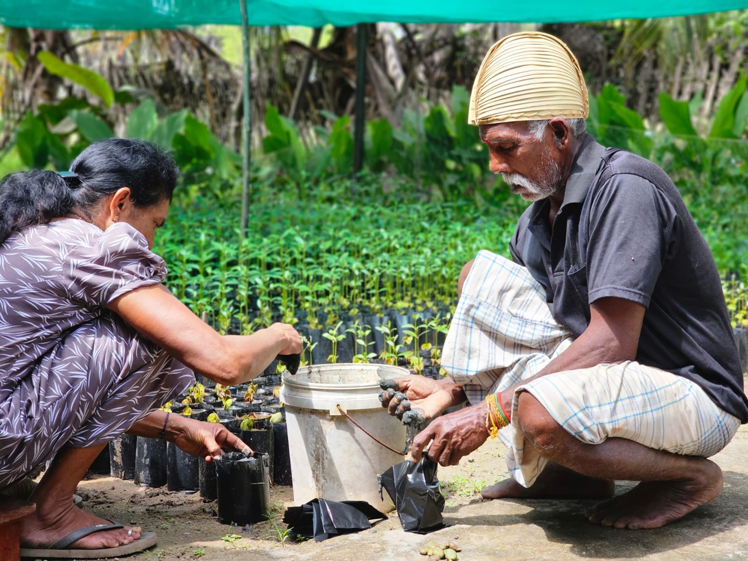 Community members meticulously nurture young mangrove seedlings in a nursery, supporting sustainable livelihoods and reforestation. (Photograph: Thiruchselvam Thivakar. District Media Officer, District Secretariat Mullaitivu)